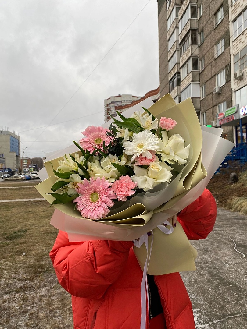 Состав: Гербера 3шт Гвоздика 3шт Альстромерия 3шт Роза французская 5шт