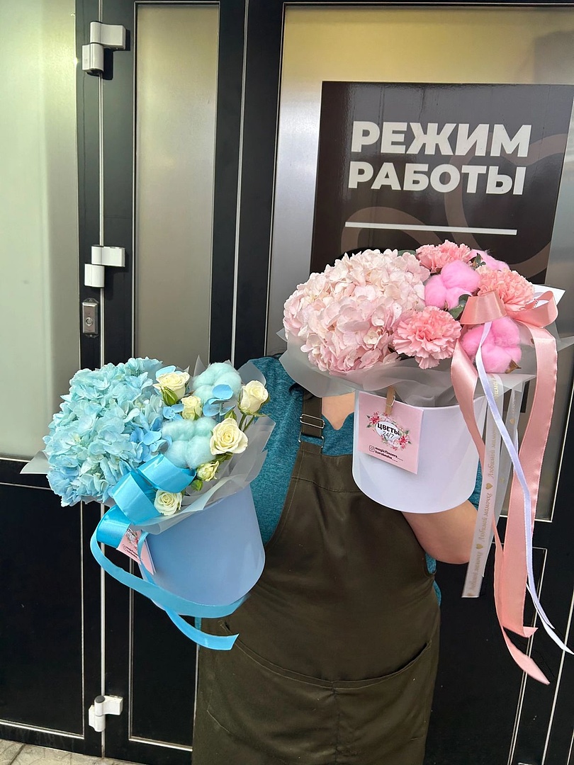 Состав: Гортензия 1шт Хлопок 3шт Эвкалипт 1шт Роза кустовая 1шт Коробка 1 Оазис 1 упаковка 1